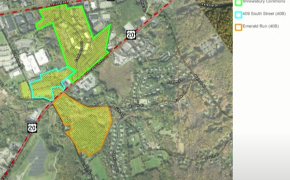 In place of the former proposal, McGoldrick presented a new proposal to see the overlay district moved westward away from the Olde Shrewsbury Village. The new zone includes a handful of parcels bordering Route 9 and Route 20, including the existing 384-unit Shrewsbury Commons apartment, as well as 33 Green St., the proposed site of a 300-unit 40B housing project and a 18.3-acre vacant parcel located at 409 South St. McGoldrick said has drawn interest from a number of developers.Â