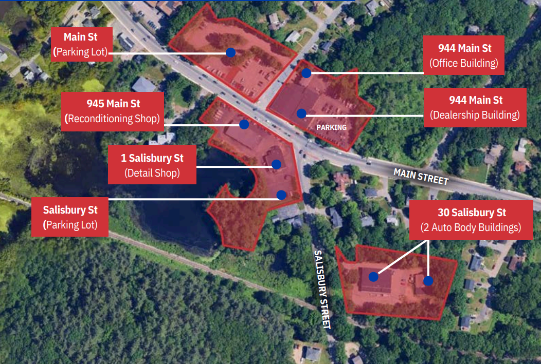 Overall, the parcels contain approximately 43,800 square feet of commercial space. The dealership at 944 Main St. and the nearby parking lot are in a commercial zone, while 945 Main St., 1 Salisbury St., and an adjacent parking lot are zoned for both commercial and multi-family residential use. The two garages at 30 Salisbury St. are in a residential zone.