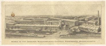 It started in 1844 in Maine when watchmaker Aaron Dennison was looking for boxes fit for the fine watches he sold. His family responded by starting a business making the sorts of boxes Dennison was looking for, before expanding to tags for retail products and luggage. The business grew under Aaron’s younger brother, E.W. Dennison, and eventually moved to Roxbury before settling in Framingham in 1897.