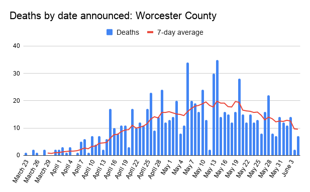 The newly reported deaths in Worcester County bring the overall death toll to 813. Across Massachusetts, there are now 7,235 probable and confirmed coronavirus deaths. Friday included 35 new confirmed deaths.