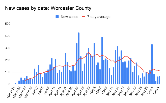 Worcester County reported 71 new coronavirus cases Friday, and seven new deaths, according to the Massachusetts Department of Public Health.