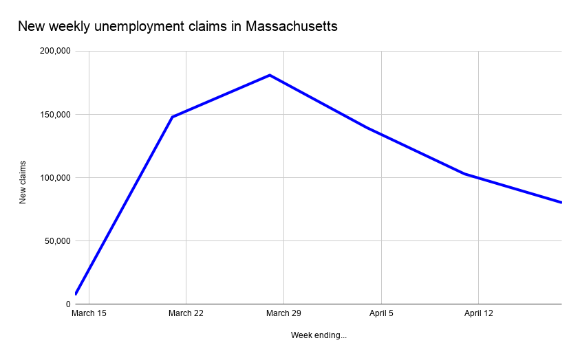 “The national and state initial claims numbers show just how quickly the economy turned,” White said in the index’s new report Thursday. “Massachusetts experienced about a sixteen-fold increase in initial claims between February and March. We’ve never seen anything like this.”