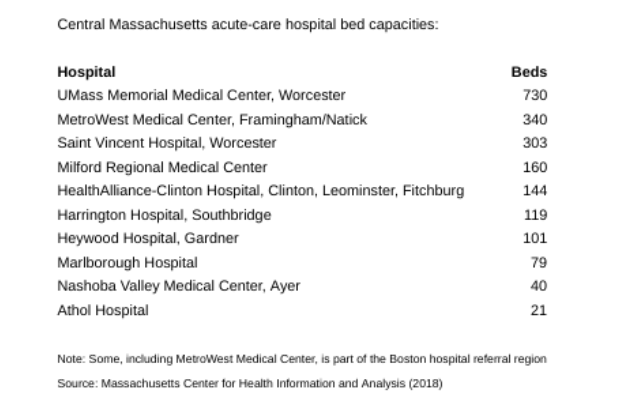 The Worcester region ranks 25th worst among 306 hospital referral regions nationally for total available hospital bed shortages, and 30th worst for intensive care bed shortages.