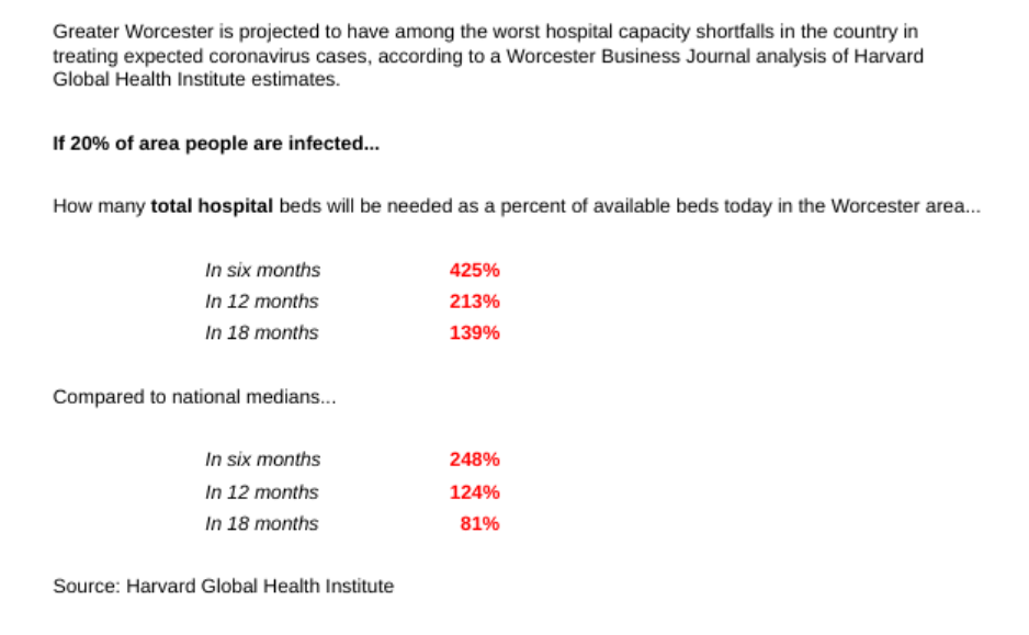 The region doesn’t appear likely to come close to having enough space to meet the needs of those who would need any hospital bed, and in particular those needing to be in an intensive care unit, according to a Worcester Business Journal analysis on Thursday of Harvard Global Health Institute estimates conducted to help inform local responses to the pandemic.