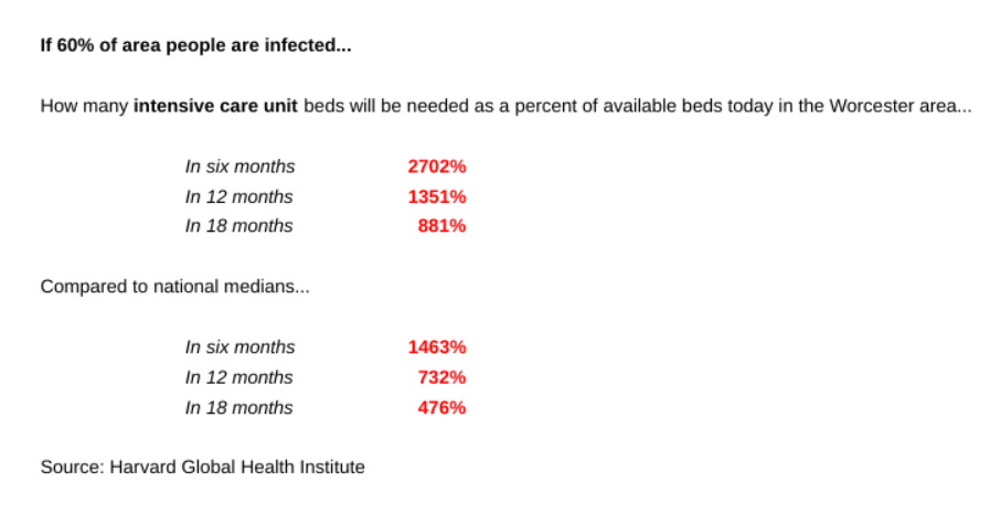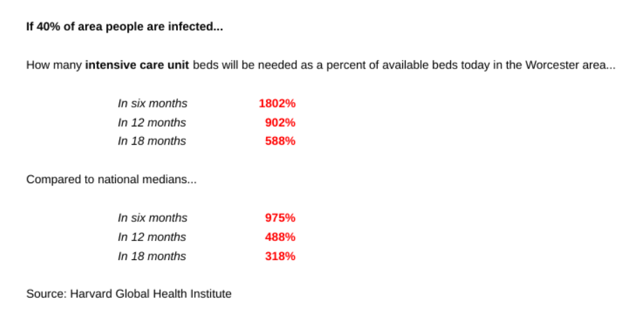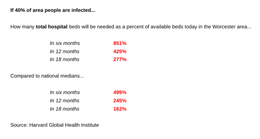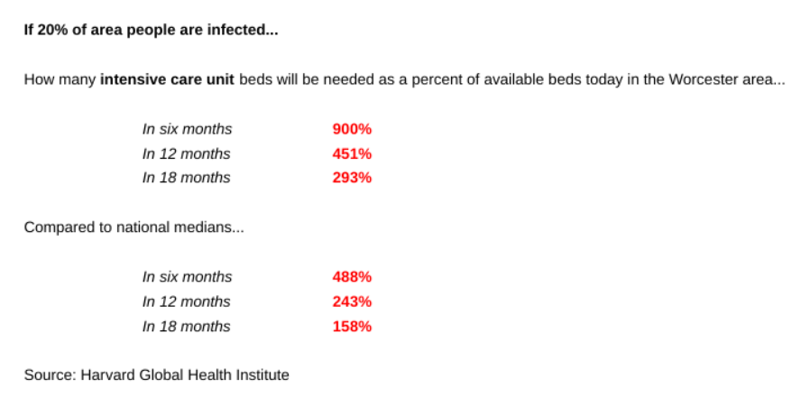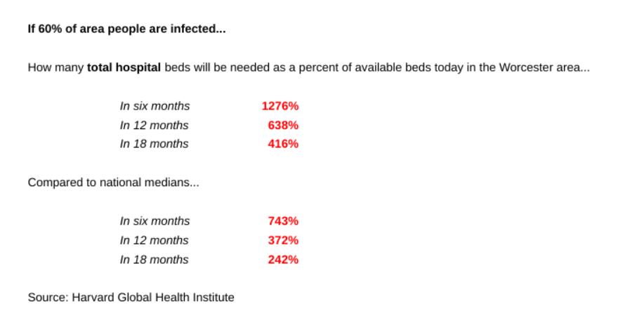 In fact, even if only 20% of the Worcester area is infected, the region still wouldn’t have enough beds if the curve were to be flattened to 18 months instead of six, according to the analysis.
