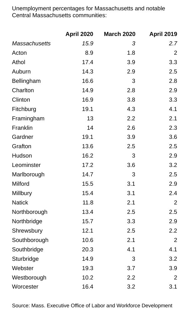 Some communities have been hit especially hard. Worcester city’s unemployment rate jumped to 16.4% from 3.2%, with roughly 11,000 more city residents claiming unemployment. Fitchburg’s rate rose to 19.1% from 4.3%, and Southbridge hit 20.3% from 4.1%.