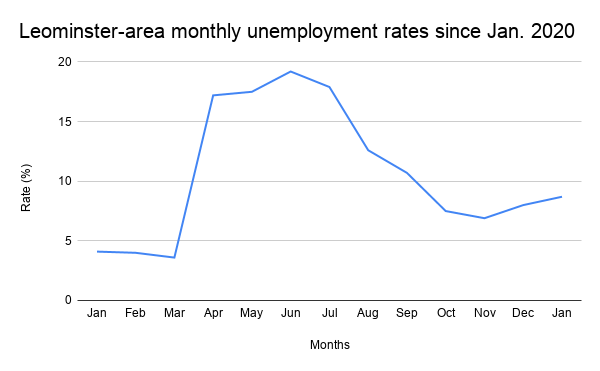 Northern Worcester County, including Leominster, Fitchburg and Gardner, had an 8.7% unemployment rate in January. That area has also seen consecutive months moving in the wrong direction, with a 6.9% rate in November and an 8.0% rate in December.
