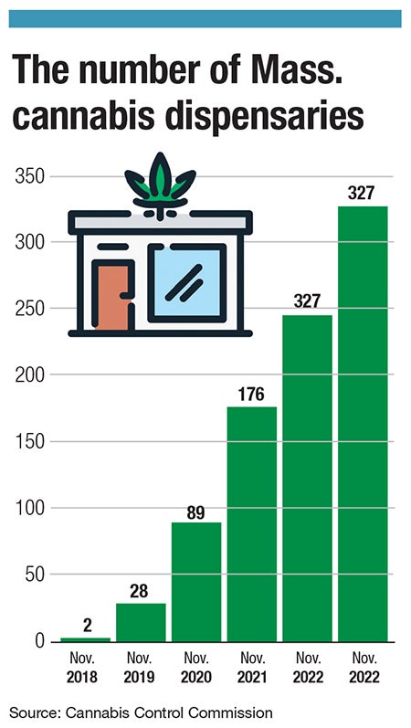 Massachusetts has 327 recreational stores that have been given permission to open, according to CCC data, just a few dozen stores shy of having one store for every one of the state’s 351 municipalities.