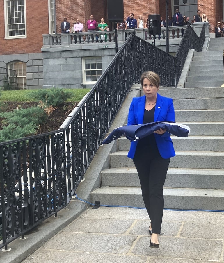 During her first 9/11 ceremony as governor, Healey solemnly descended the steps of the state Capitol with an American flag, which was raised to half-staff. Healey remained at the flagpole during renditions of “The Star-Spangled Banner” and “Taps.”