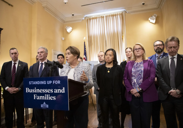 In addition to Hao, the governor was joined at the press conference by Administration and Finance Secretary Matthew Gorzkowicz, Greater Boston Chamber of Commerce CEO James Rooney, Associated Industries of Massachusetts President Brooke Thomson, Retailers Association of Massachusetts President Jon Hurst, Mass. Business Roundtable President JD Chesloff, Black Economic Council of Mass. President Nicole Obi, and ALX President Eneida Roman.