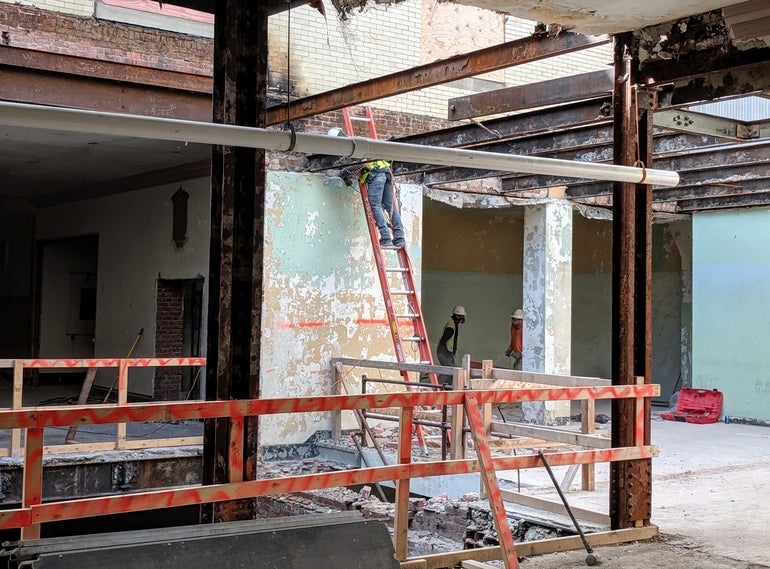 Construction officials gave a media tour Tuesday at a point during the $53-million project when the old Lincoln Square building is stripped down about as much as it can be. Asbestos and other contaminants have been removed, as have windows and drop ceilings. Some new wall framing and ventilation is going up, and new windows will be installed in the next few weeks.