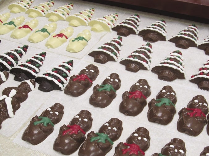 His 10 part-time employees are constantly pouring chocolate into molds, creating various shapes and flavors. The holiday season is huge for the Happy Chocolatier – with just one year under his belt, McMahon thinks it will account for up to 40 percent of annual sales.