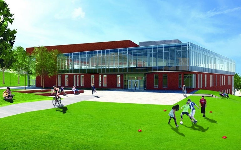 The 52,000-square-foot center will be home to Holy Cross’ campus recreation and intramural sports, including sports courts, weight rooms, a golf simulator, rooms for yoga, cycling and fitness and a jogging track.