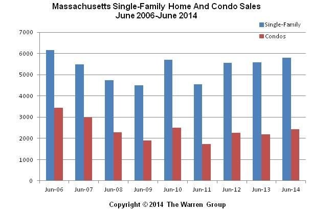 In a separate report by The Warren Group, year-to-date home sales are down from 21,662 to 21,272, while year-to-date condo sales are up from 8,744 to 9,592.