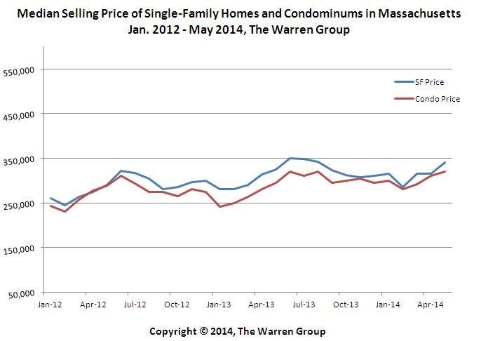 The median price for homes sold in the first five months of 2014 is 6.3 percent higher than 2013, The Warren Group said, while the median condo price is up 8.5 percent.