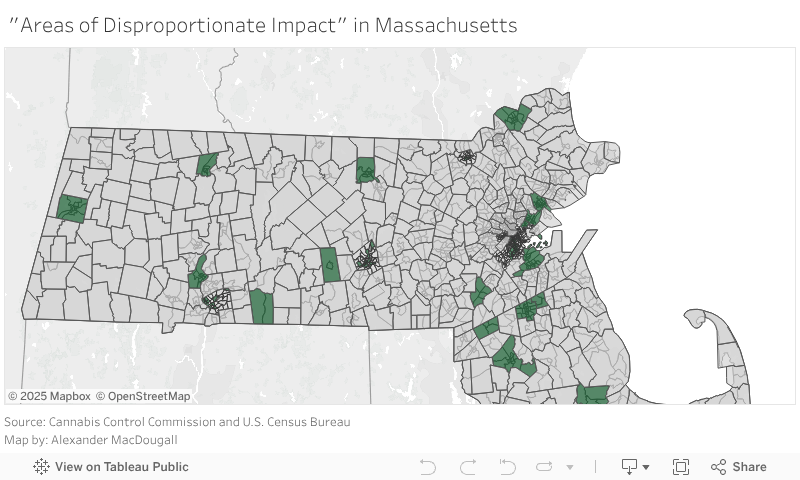 The CCC lists 29 towns and cities as areas of disproportionate impact. It includes four of the five largest cities in the state (Boston, Worcester, Springfield, and Lowell) but only counts certain census tracts within those cities.