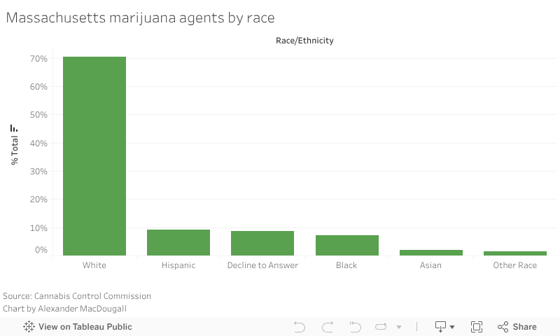 Now, six years after cannabis legalization in Massachusetts, it’s clear the fledgling industry remains unequal. The industry remains overwhelmingly white and male: According to data from the Massachusetts regulatory body Cannabis Control Commission, 79% of marijuana establishments are owned by white men, compared to 10% owned by people of color. In terms of gender, 92% are owned by men and 8% are owned by women.