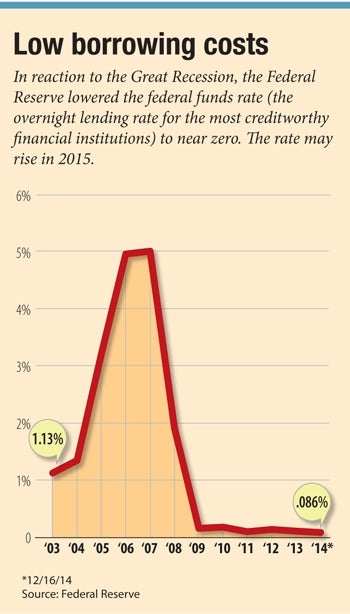 The Federal Reserve will likely raise interest rates halfway through the year, according to most industry predictions, but even then it will be by less than one percent. Forty-six percent of economists in a December survey by the National Association for Business Economics predicted that the Fed will raise its key overnight lending rate in the third quarter, with the rate reaching only 0.75 percent by the end of 2015, compared to 0.845 percent in its previous survey, in September.