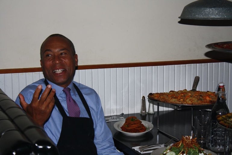 While stumping Wednesday with his party’s candidate for lieutenant governor, Steve Kerrigan, Gov. Deval Patrick stopped in Hudson to enjoy a flatbread.