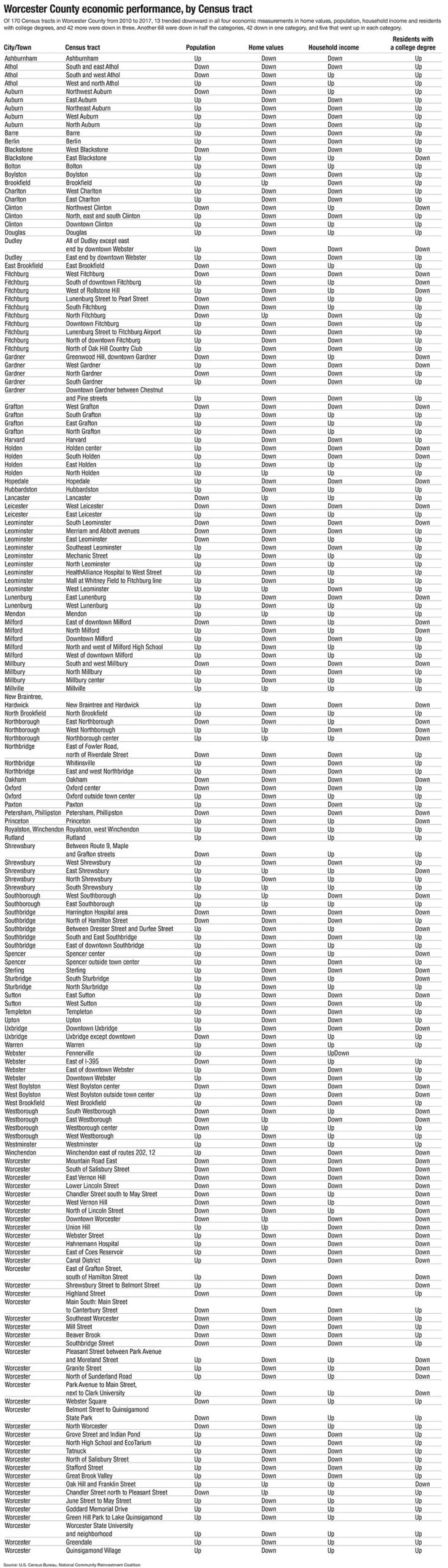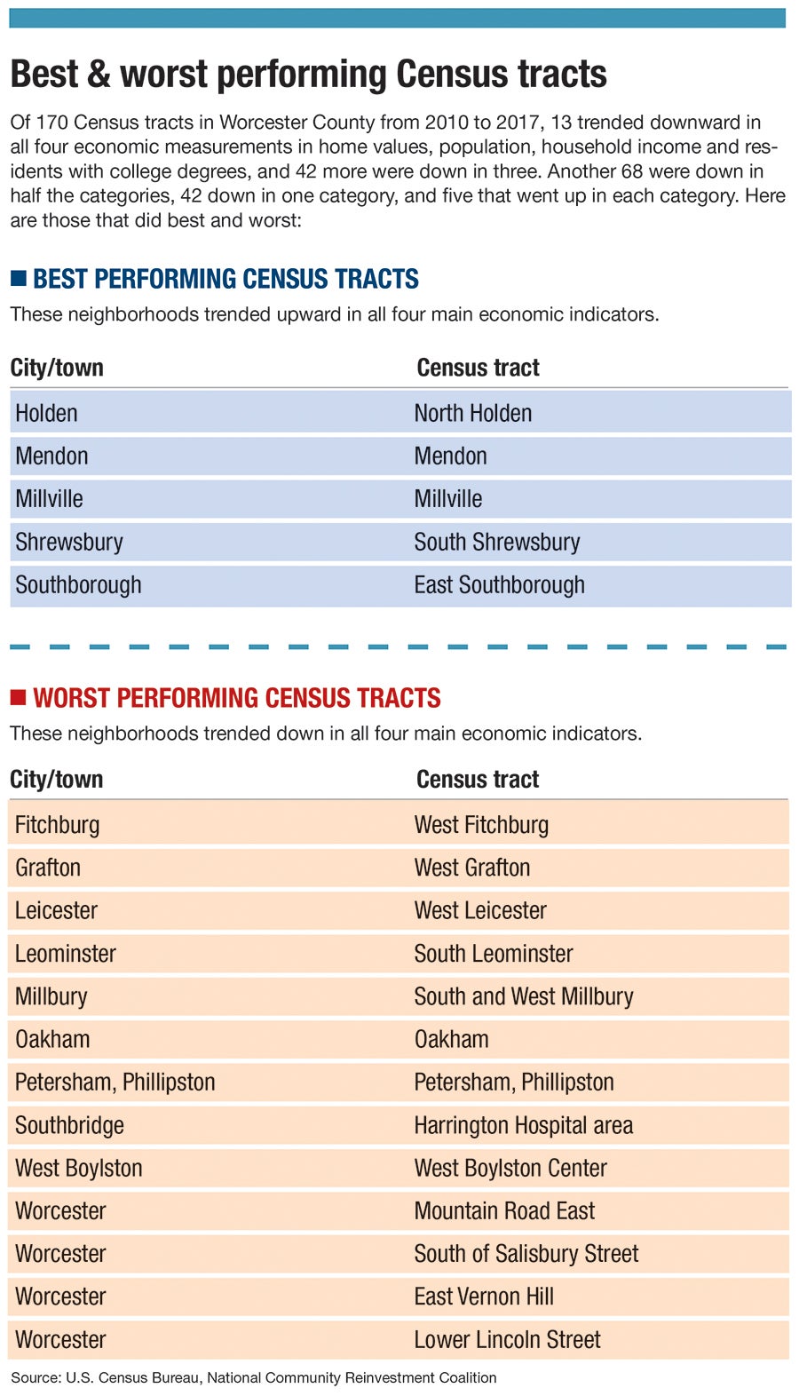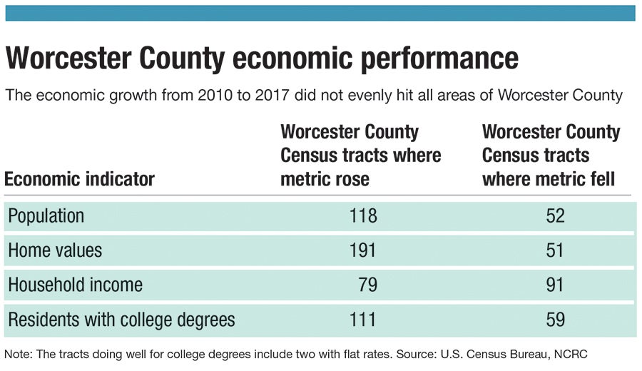 Looking at four key economic indicators of population growth, rising home values, increasing household income and residents with college degrees, 55 of the 170 Census tracts in Worcester County had decreases in three or all four categories, according to a Worcester Business Journal analysis of data from 2010 to 2017 compiled by the National Community Reinvestment Coalition, a Washington, D.C. economic research and advocacy group.