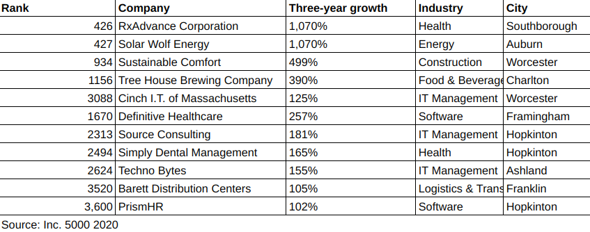 Others in the top 5,000 represented companies from software, IT management, and food and beverage industry, including the popular Tree House Brewing Co. in Charlton, which ranked 1,156 and had a reported 390% growth.