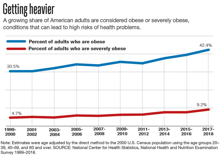 In less than two decades, the rate of American adults counted as obese rose from 30.5% to 42.4%, according to a 2018 study by the National Center for Health Statistics, part of the U.S. Centers for Disease Control and Prevention. For those considered severely obese, those numbers jumped from 4.7% to 9.2%.