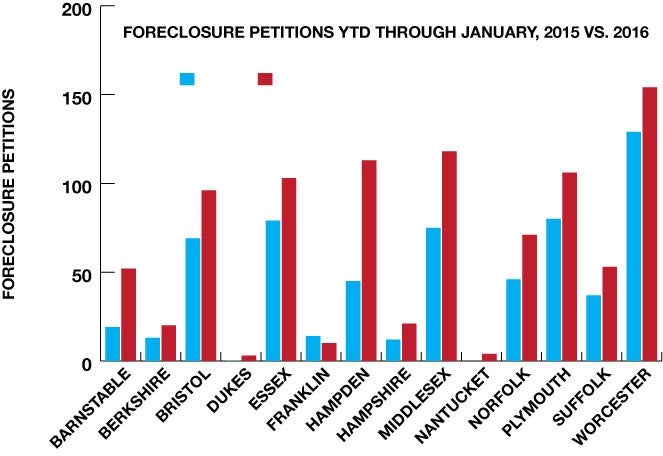 The foreclosure petitions in Worcester County were below the state average, only growing 19 percent year-over-year for January to 53 petitions. The city of Worcester, however, accounted for the vast majority of those petitions, with the 49 petitions filed in January representing 44 percent year-over-year growth.