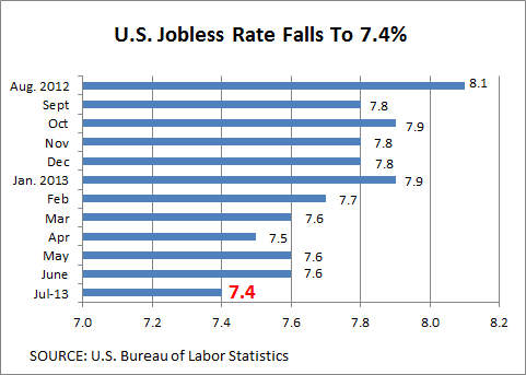 However, the unemployment rate fell to 7.4 percent, its lowest level since December 2008, when it was 7.3 percent. It rose as high as 10 percent in October 2009 before falling gradually. At the start of this year, the jobless rate was 7.9 percent.