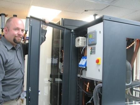 Inside the 350-square-foot demonstration room, potential clients can literally put their hands inside the data processing rack, where it is up to 105 degrees. Then, once the door is closed, the air exhaust is about 72 degrees.