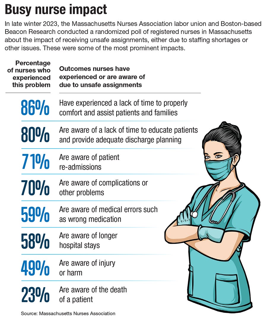 The problem over nurses leaving the profession comes as nurses face mounting challenges like unsafe assignments and staffing shortages, according to the 2024 edition of the MNA’s State of Nursing in Massachusetts survey.