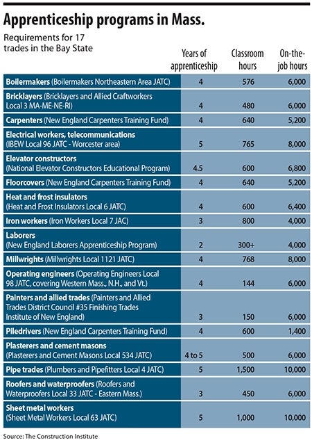 The New England Regional Council of Carpenters has about 60 apprentices in Worcester County, according to Minasian. Over a four-year-long process, they work on-site, and also receive training at the New England Carpenters Training Center in Millbury.