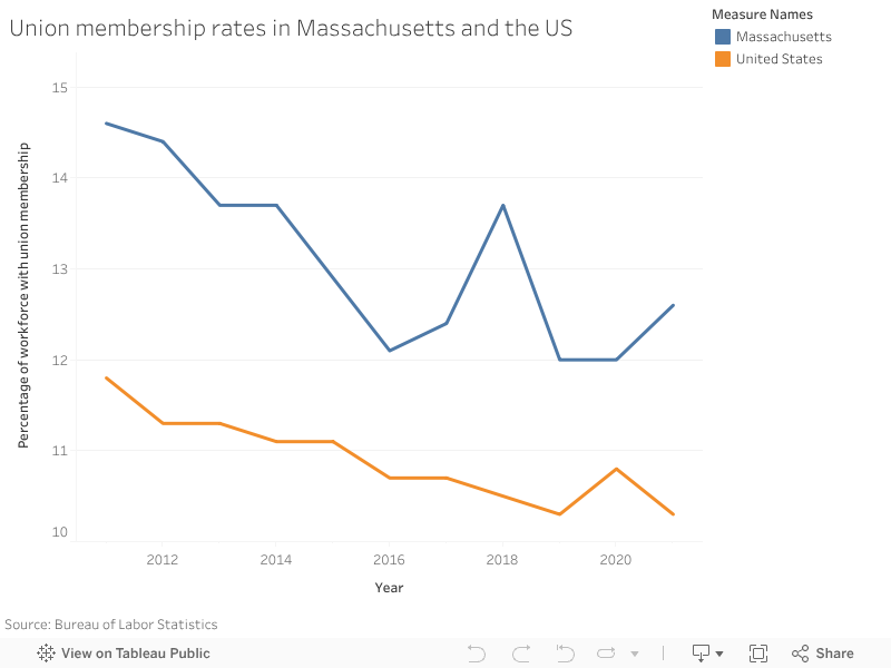 In Massachusetts, where the percentage of the unionized workforce has been higher than the national average over the past two decades, union membership dropped from a post-millennium high of 16.6% in 2009 to 12.6% in 2021, according to BLS.