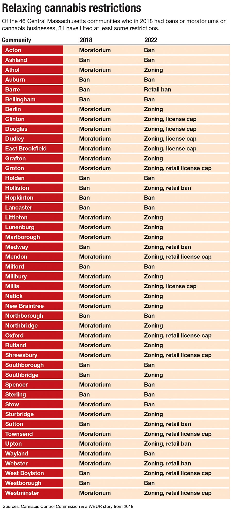 Of the 46 municipalities in Central Massachusetts who had an initial ban or moratorium on the industry operating in their communities, about 67% of those towns and cities have loosened restrictions.
