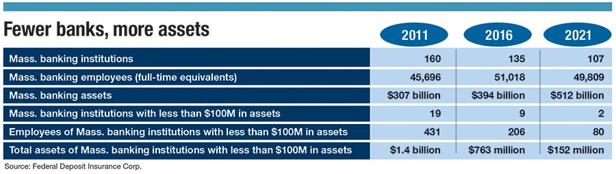 From 2011 to 2021, the total number of Massachusetts banks declined by 34%, even while the total dollar value of their assets increased 66%, according to FDIC.
