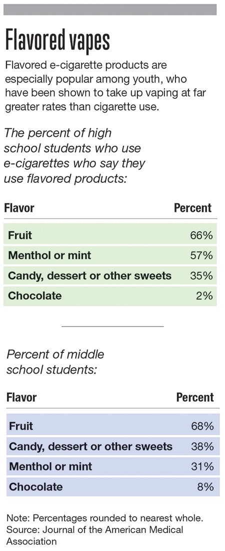 Another Journal of the American Medical Association study in 2016 found a connection between youth vaping and an eventual use of cigarettes, and a study published in November in the journal Pediatrics found an association between the use of flavored vaping products and higher continued usage of e-cigarettes.