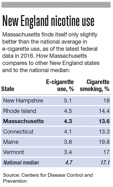 Massachusetts has among the country’s lowest cigarette smoking rates but hasn’t been immune to the rise of vaping. A 2016 report by the CDC said 4.3% of Massachusetts adults vaped, not significantly better than the national median of 4.7%.