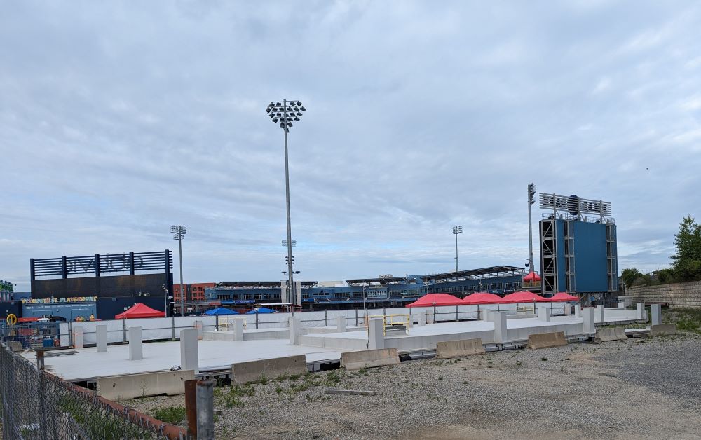 The WooSox have temporarily taken over part of the site with a deck with live music and other attractions for fans.