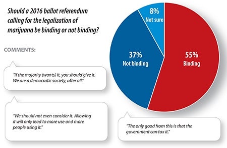 Three years ago, Massachusetts voters approved the medical use of marijuana via a binding ballot referendum. Now with two states having made recreational pot legal and others leaning that way, should voters here decide that too? Last month, Senate President Stanley Rosenberg said he has floated the idea of a non-binding ballot question for 2016. Should a ballot question on legalizing marijuana be binding? Most of last week’s Flash Poll voters said it should.
