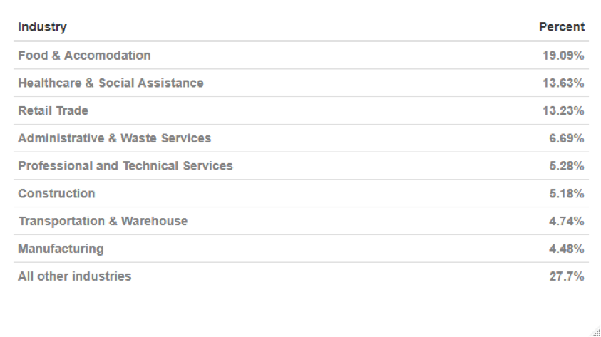 The industry with the most unemployment claims in the week ending June 20 is food & accommodation, making up 19% of all claims. It was followed by healthcare & social assistance (14%) and retail (13%), according to the Massachusetts Executive Office of Labor & Workforce Development.