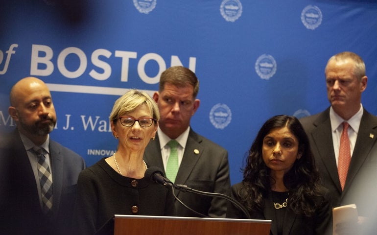 “As you can see, this truly is an all hands on deck approach. We’re working together, there is no space between any of us on this issue because there’s such still such an unknown,” Walsh said, flanked by public health and public safety personnel from the city and state levels.