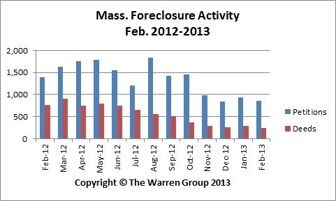 In February, there were 240 foreclosure deeds – representing completed foreclosures – filed statewide, down almost 69 percent from 767 in February 2012. Deeds were down 63 percent in Worcester County, to 62, and 68 percent in Middlesex County, to 36.