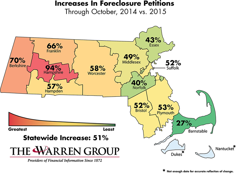Hampshire County had the largest growth in foreclosures of any county in the state, with a 94-percent increase over the previous year. Towns like Belchertown, Northampton and Ware each have had double-digit foreclosures petitions and more than 100-percent growth year-over-year.
