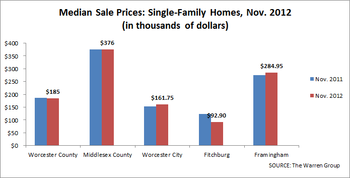 Year-over-year sales in Worcester County were also up substantially, according to The Warren Group. Sales of single-family homes rose 31 percent, but sales of condominiums were much more robust, rising 83 percent over November 2011. In Middlesex County, single-family home sales rose 35 percent; condos 27 percent. Median prices showed little change in Worcester County; in Middlesex County, the median for condominiums rose 10 percent while the average for single-family homes was flat.