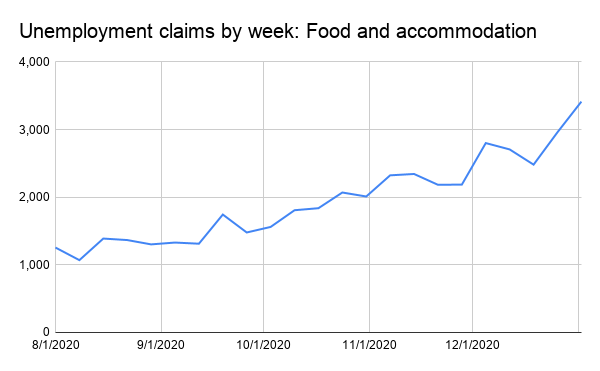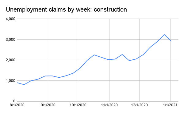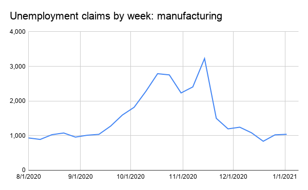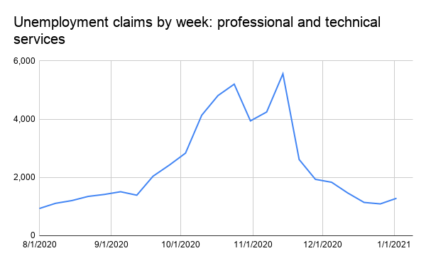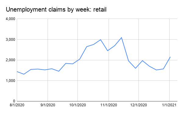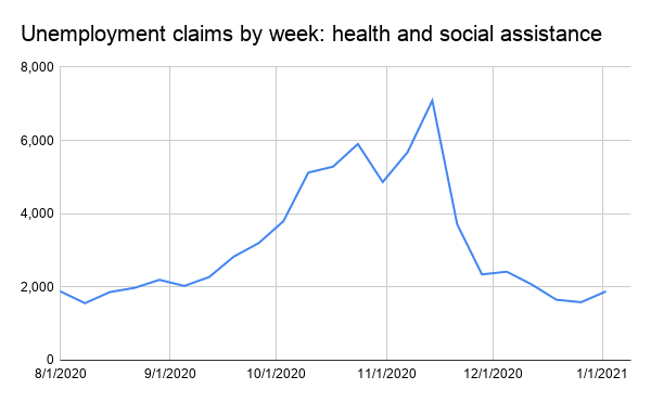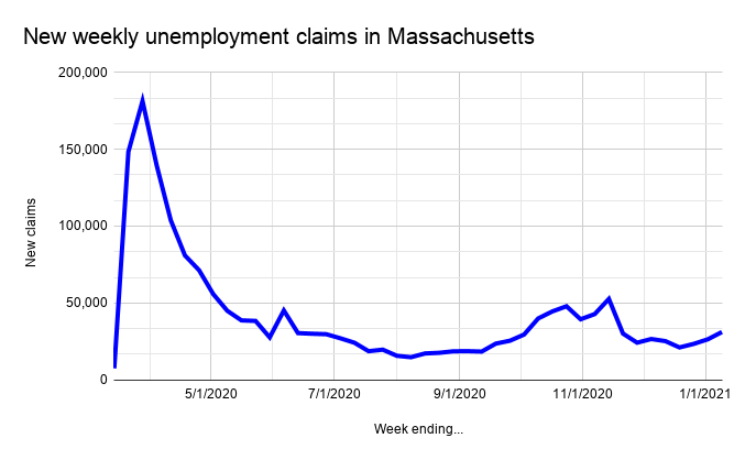 Massachusetts saw more than 31,000 new unemployment claims filed in the week ending Jan. 9, with the sharpest upticks in both retail as well as food and accommodation — the former a potential effect of temporary holiday season employment ending, and the latter likely due to tighter restrictions the state has placed on business capacities, including restaurants. Administrative jobs and health and social assistance jobs also continue to see high numbers of new unemployment claims.