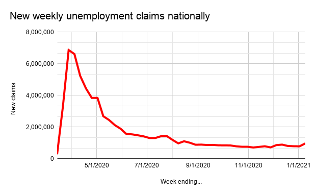 The U.S. had 985,000 new claims in the week ending Jan. 9, its most since August and a 22% increase from the week leading up to Christmas. The national unemployment rate in December of 6.7% was its best since the pandemic began, and a drastic improvement from 14.8% in April. But the rate of the population employed stood at just 57%, compared to 61% before the pandemic hit.