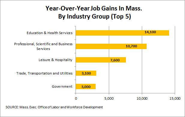 From March 2012 through last month, the Bay State added 40,300 jobs, 37,300 of which were in the private sector, officials said.