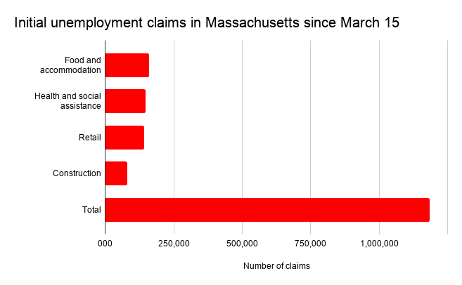 Almost 1.2 million new unemployment claims have been filed in Massachusetts since mid-March. The hardest-hit industries during that time have been in food and accommodation (159,532 claims through the week ending Aug. 1), health and social assistance (147,773) and retail (142,459).