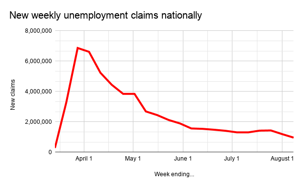Massachusetts residents filed 14,181 new unemployment claims in the week ending Aug. 8, the U.S. Department of Labor reported Thursday, which came as relatively good news that was echoed nationally. Across the country, new weekly unemployment claims fell below 1 million for the first time since the first half of March.