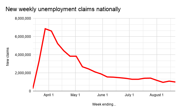 Nationally, unemployment claims continue to remain high with another 1 million filled last week. The new claims are a slight decrease from the prior week’s 1.1 million, and bring the total claims filed since the beginning of the pandemic to 59.3 million.