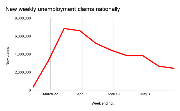 The national unemployment rate for April was 14.7%, the highest since during the Great Depression. Roughly 39 million workers have filed new unemployment claims nationally in the past nine weeks.
